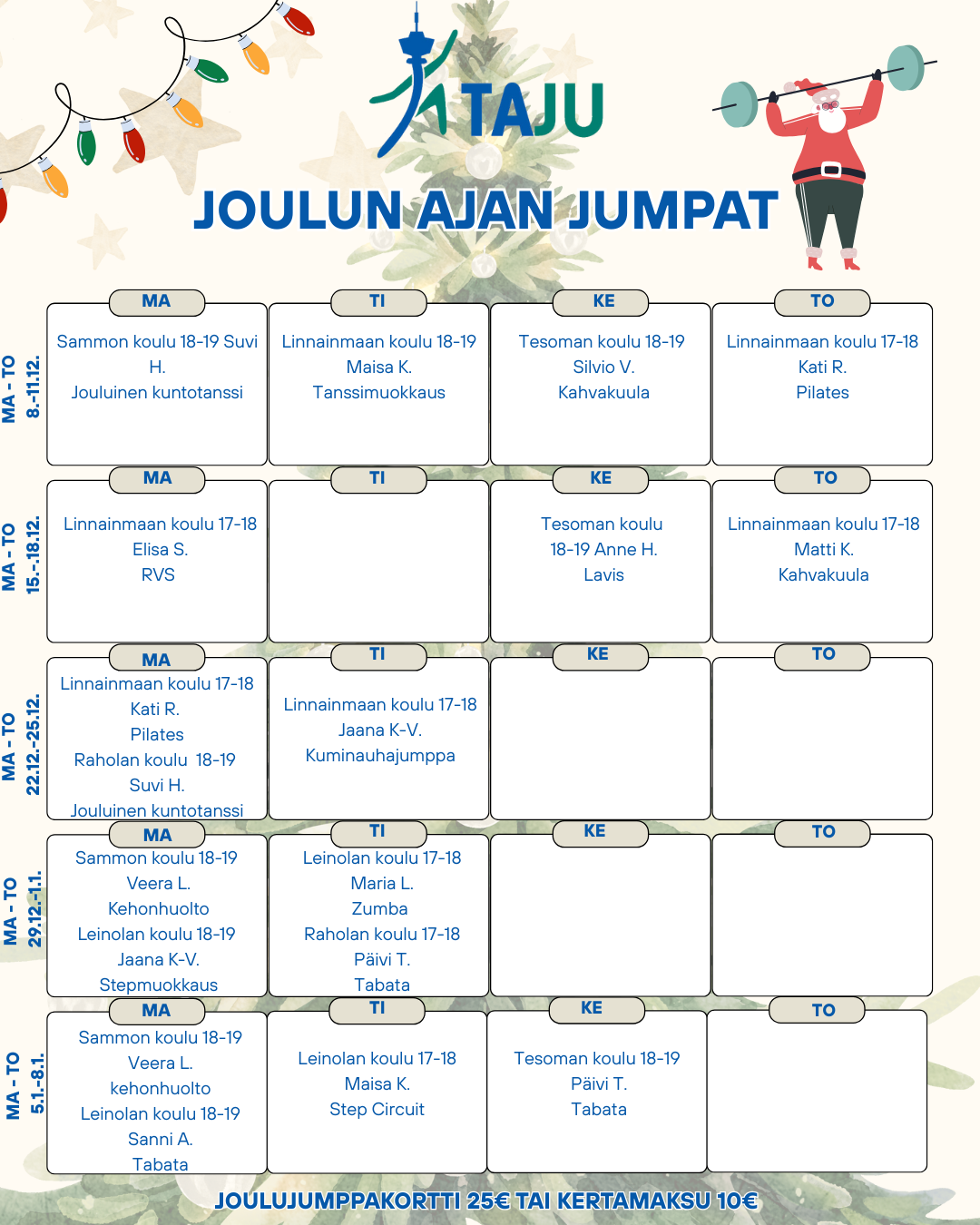 Aikuisten joulujumpat alkavat 8.12. ja jatkuvat aina 11.1. saakka. Jumppia järjestetään maanantaista torstaihin yllä olevan aikataulun mukaan.