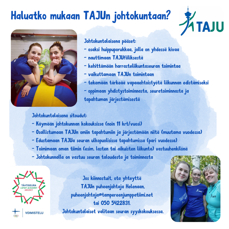 Lisäksi otamme mielellämme TET-harjoittelijoita tai muita harjoittelijoita, jotka ovat kiinnostuneita liikunta-alasta tai järjestötoiminnasta. TAJUssa harjoittelija voi olla esimerkiksi mukana järjestämässä tapahtumia, tekemässä markkinointia tai kehittämässä materiaaleja.
