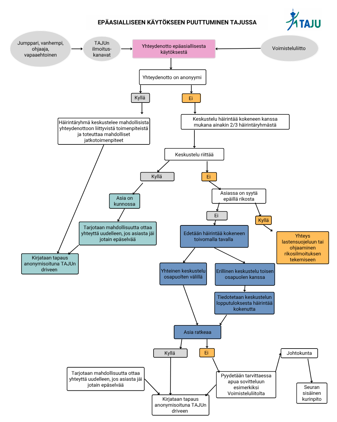Yhteyshenkilöt vievät asian käsiteltäväksi häirintätiimille, joka koostuu häirintäyhdyshenkilöstä, toiminnanjohtajasta ja puheenjohtajasta. Häirintätapauksia käsittelee pääosin aina kolme, vähintään kaksi kolmesta häirintätiimin kuuluvista henkilöistä. Jos tapaus kohdistuu palkkasuhteessa TAJUun olevaan henkilöön, mukaan häirintätiimiin kutsutaan myös työsuojeluvaltuutettu.