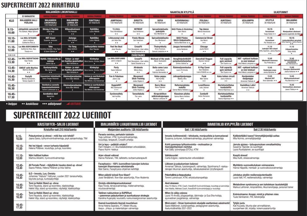 Supertreenit on hyvän olon liikuntatapahtuma Naantalissa. Päivän aikana pääset nauttimaan elämyksellisistä ryhmäliikuntatunneista sekä kuuntelemaan mielenkiintoisia luentoja. Voit rakentaa itse omannäköisen Supertreeni -päivän houkuttelevasta tarjonnasta. https://www.supertreenit.fi/