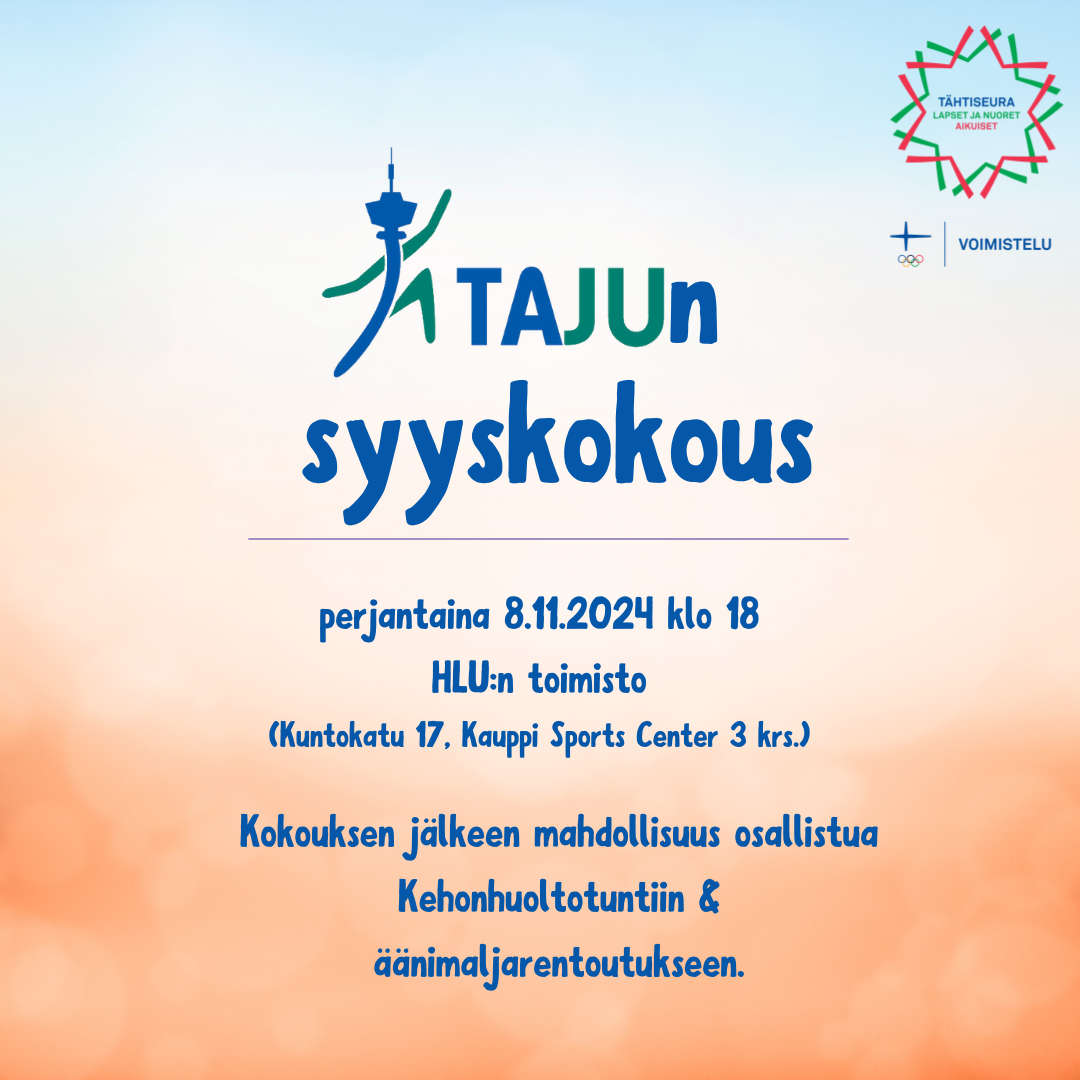 Syyskokous järjestetään perjantaina 8.11.2024 klo 18.00 Hämeen Liikunnan ja Urheilun, Kauppi Sports Center, osoitteessa Kuntokatu 17. Kokouksessa käsitellään sääntömääräiset asiat.