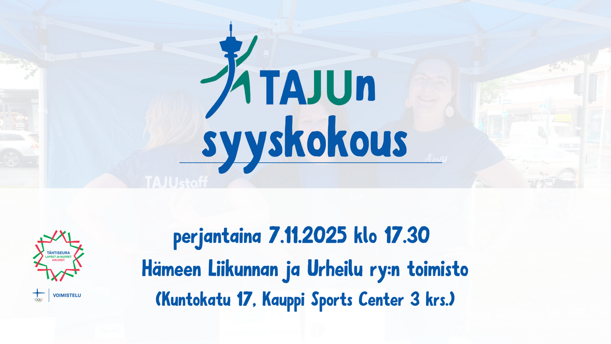 Ilmoittaudu kokoukseen mukaan viimeistään torstaina 6.11. klo 15 mennessä myClub-järjestelmän kautta: https://taju.myclub.fi/flow/events/9799369.