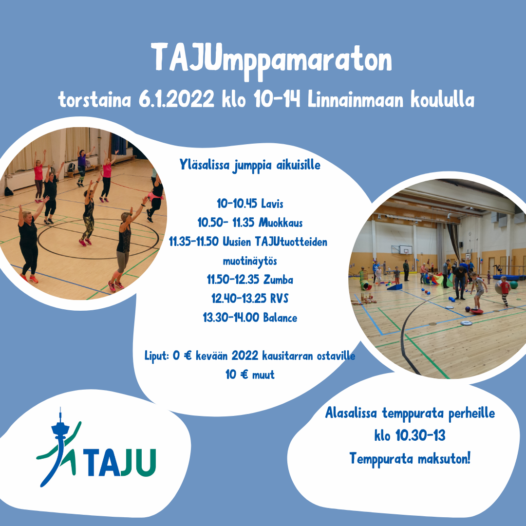 Aloita vuosi mukavasti jumppamaratonin parissa! Tampereen Jumppatiimi TAJU ry:n perinteinen TAJUmppamaraton järjestetään torstaina 6.1.2022 klo 10-14 Linnainmaan koululla.