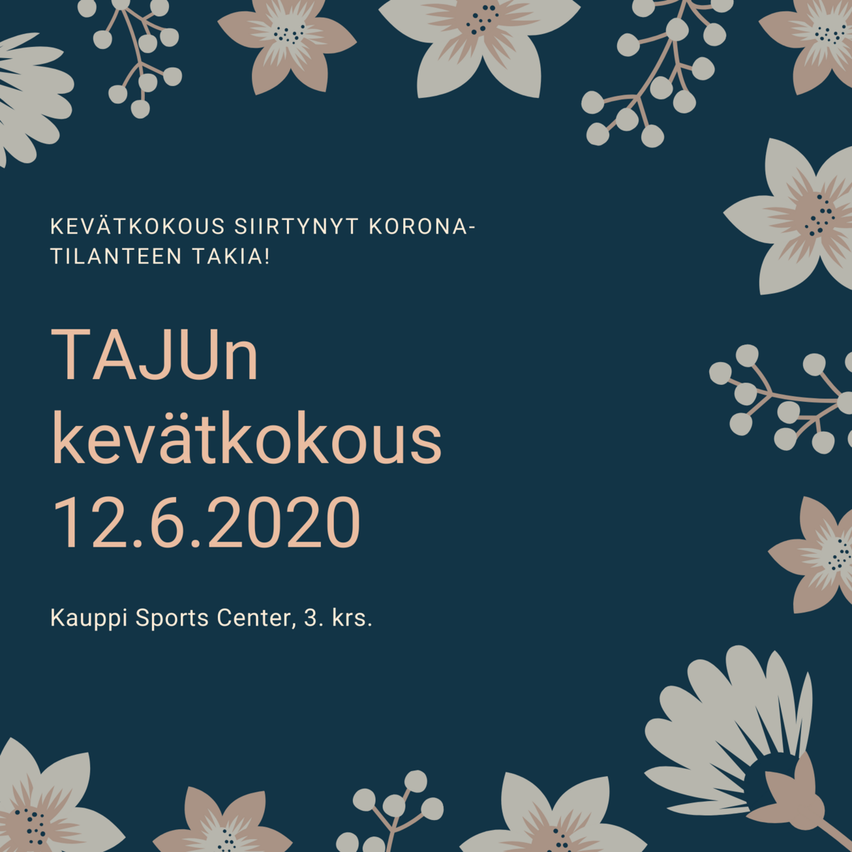 Koronaepidemian vuoksi seuran johtokunta siirsi yhdistyksen sääntömääräisen kokouksen ajankohtaa. Noudatamme näin Suomen hallituksen antamia linjauksia koronatilanteeseen liittyen. Haluamme myös huolehtia ihmisten terveydestä. Emme halua kevätkokouksen pitämisen aiheuttavan vaaraa jäsenillemme. TAJUn säännöt eivät myöskään mahdollista etäosallistumista yhdistyksen kokouksiin.