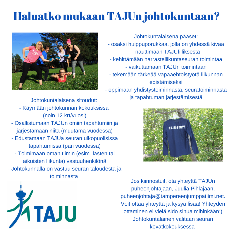 Jos sinua kiinnostaa johtokunta tai muu vapaaehtoistehtävä TAJUssa, ota pian yhteyttä johtokunnan puheenjohtajaan Juulia Pihlajaan puheenjohtaja@tampereenjumppatiimi.net!