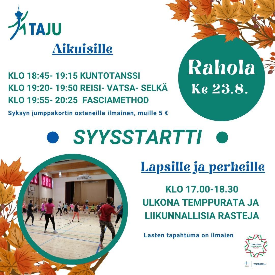 Raholan Syysstartti käynnistää Länsi-Tampereen syksyn jumpat keskiviikkona 23.8. Tapahtumassa on ohjelmaa sekä lapsille, että aikuisille.
