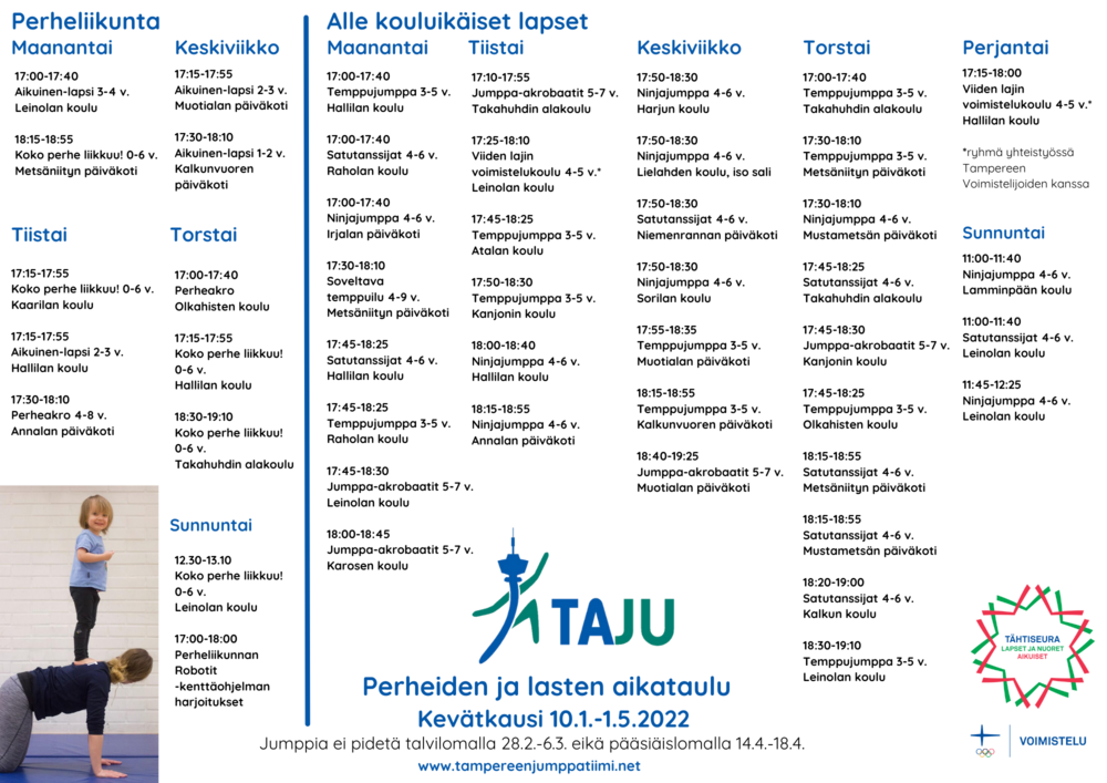 TAJUn kevätkausi alkaa 10.1.2022 ja päättyy 1.5.2022. Jumppia ei pidetä talvilomalla 28.2.-6.3.2022 eikä pääsiäislomalla 14.4.-18.4.2022.