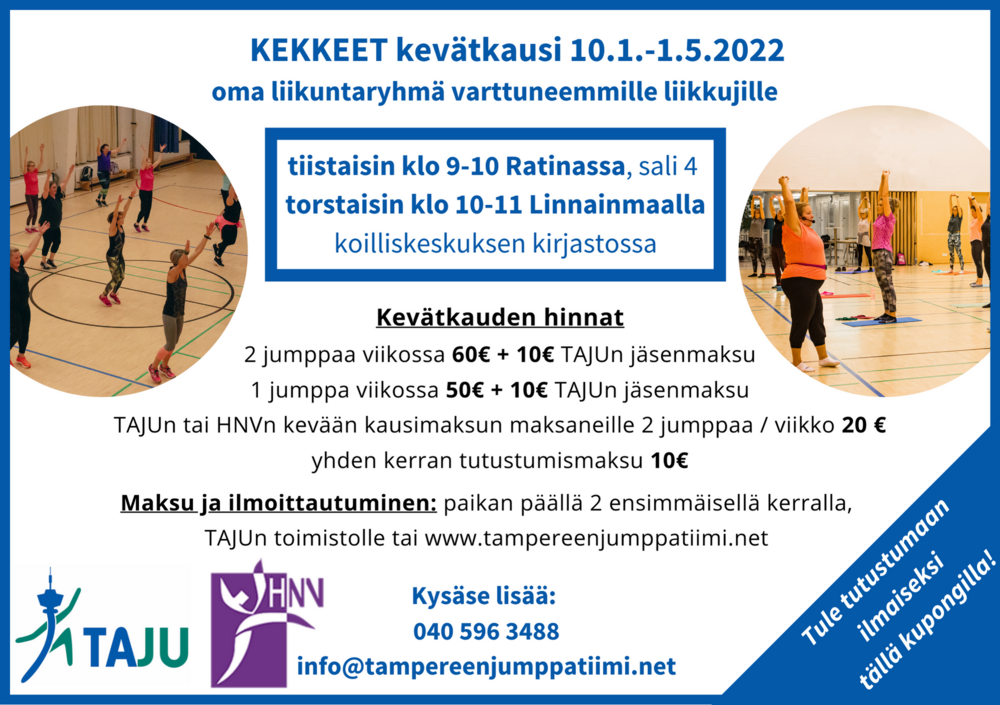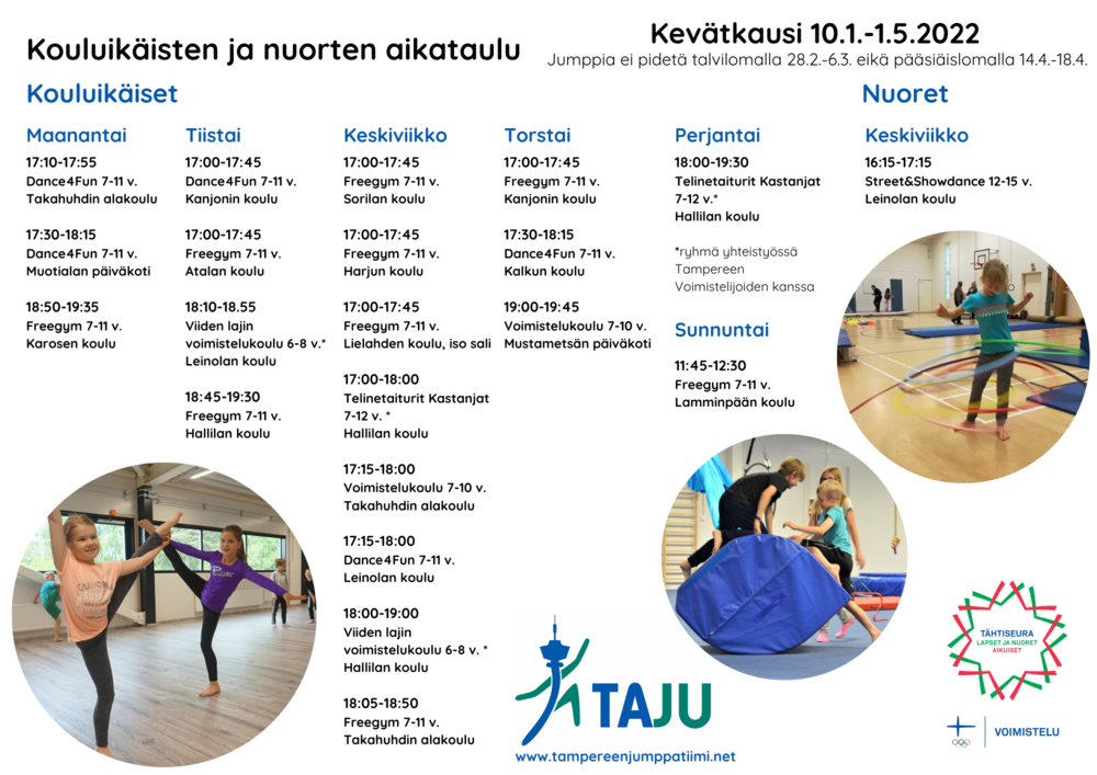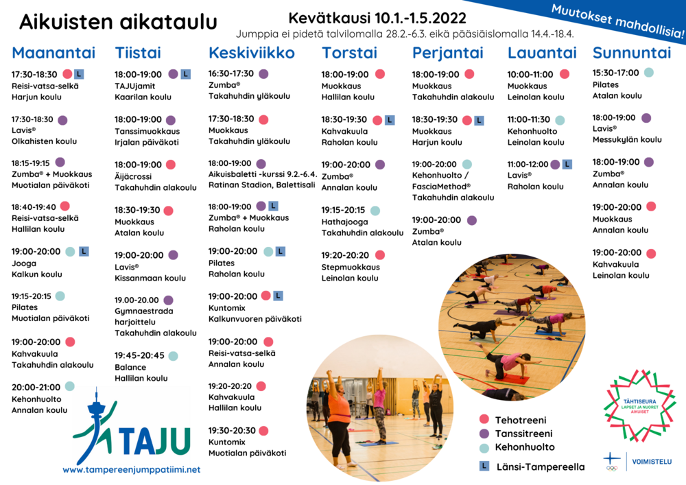 TAJUn kevätkausi alkaa 10.1.2022 ja päättyy 1.5.2022. Jumppia ei pidetä talvilomalla 28.2.-6.3.2022 eikä pääsiäislomalla 14.4.-18.4.2022.